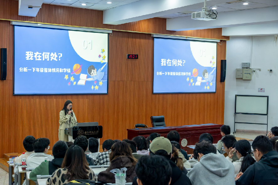 会议伊始,辅导员王小珂、王青分别围绕《大二,找到属于你的位置》和《越努力,越幸运》展开主题月讲评。王小珂通过学业数据分析指出,年级整体学业基础良好,但面临核心课程挑战加剧、内部分化显现等现实问题。建议同学们立足学业根本,将前瞻性压力转化为具体行动计划,并强调培养独立思考的习惯,鼓励同学们在主动探索、理性辨别中实现成长突破。